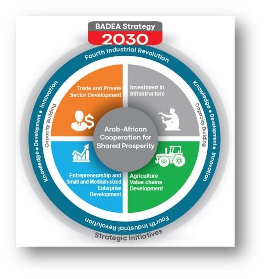 Introduction of BADEA’s 2030 Strategy ( 2020 - 2030 ) BADEA developed its new long-term strategy through focus on five specific development areas: infrastructure; agriculture value-chains; trade and private sector; entrepreneurship and SMEs and capacity development.